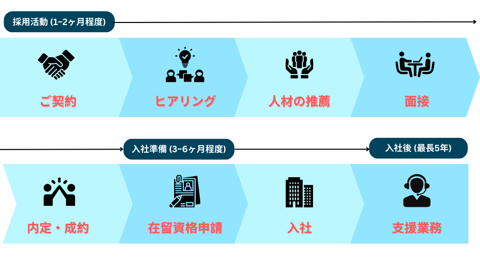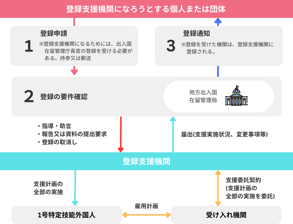 登録支援機関とは、受入れ機関(特定技能所属機関)から委託を受け、1号特定技能外国人支援計画の全ての業務を実施する者のことです。